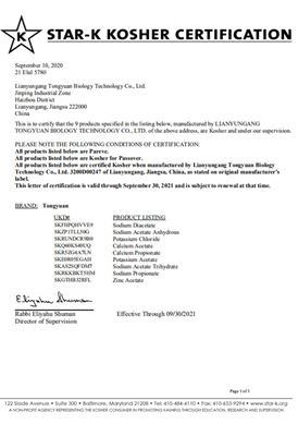 企業(yè)質(zhì)量方針科學(xué)化,精細(xì)化的管理 ----------追求出色品質(zhì)企業(yè)建立了完善的質(zhì)量確保體系,實(shí)施ISO22000-9000質(zhì)量管理,配備了經(jīng)過專業(yè)培訓(xùn)和考核的質(zhì)量人員和完整的分析儀器,對從原材料供應(yīng)、產(chǎn)品生產(chǎn)、包裝、儲藏到運(yùn)輸?shù)娜^程實(shí)施監(jiān)督管理,并制定了一系列質(zhì)量標(biāo)準(zhǔn)管理程序(SMP),標(biāo)準(zhǔn)操作程序(SOP)和標(biāo)準(zhǔn)質(zhì)量指標(biāo)(STP)以確保產(chǎn)品的品質(zhì)。 我們所持有的證書經(jīng)過多年的發(fā)展。連云港通源化工有限公司至今已有的證書具體如下:衛(wèi)生食品許可證/Kosher/Halal/ISO22000-9000